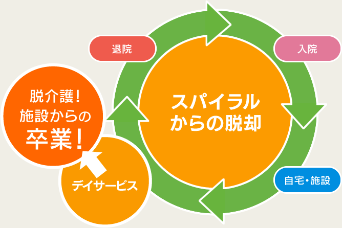 高齢者が入退院を繰り返す負のスパイラルから抜け出すには、社会とのつながりが必要であり、高齢者就労支援によりこれを実現します。